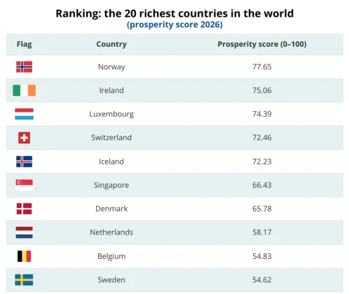В отличие от классических рейтингов, основанных на ВВП, новый индекс объединяет данные IMF, World Bank, UNDP, а также Евростата и ОЭСР. Он оценивает более 50 стран по стобалльной шкале, учитывая, насколько экономическое богатство отражается в реальной жизни граждан.