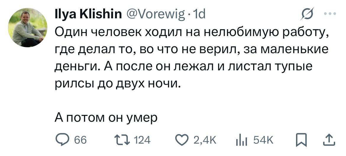 3 ноября 2025, 21:05 Настя ИзмайловаЮмор за день и депрешн ✕ Размер шрифта: 17px ✕ Ссылка скопирована! Пожелание шотландцу: семь дюймов под килтом. юмор