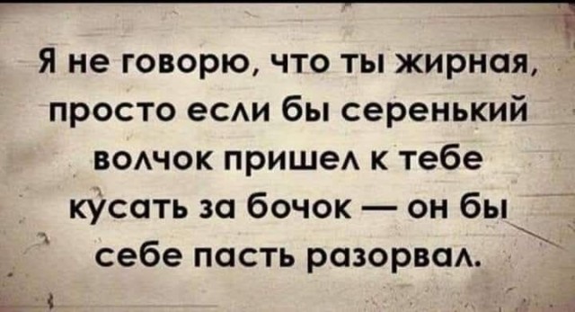 12 ноября 2025, 15:08 Алексей ИвановЮмор для тех, кто уже повзрослел и понял, что «подарок судьбы» - это тёплая батарея зимой ✕ Размер шрифта: 17px ✕ Ссылка скопирована! Очередная порция веселья для тех, кто понял жизнь и в цирке не смеется, потому что он в нем живёт.