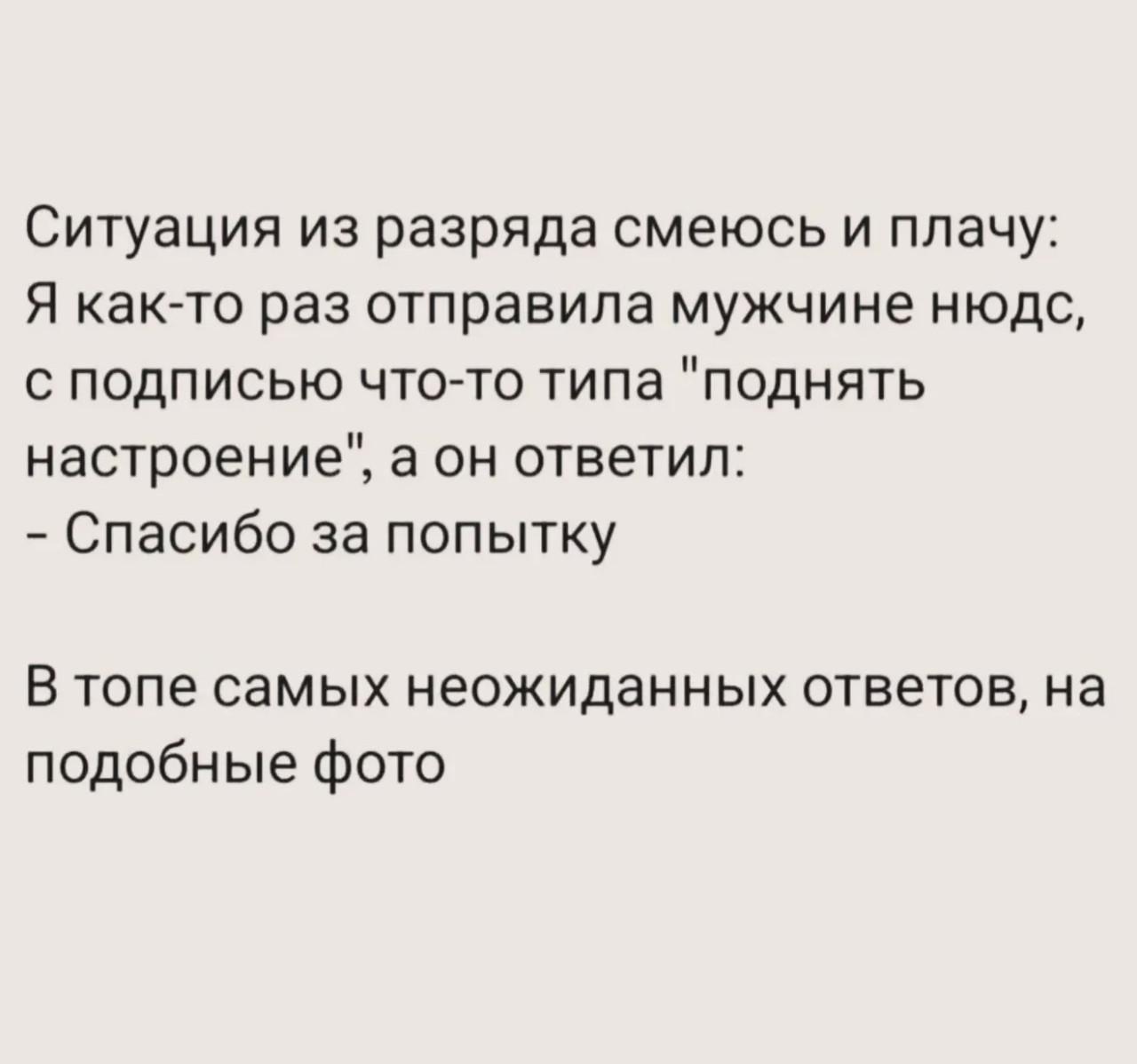 13 декабря 2025, 19:05 Настя ИзмайловаЮмор за 13 декабря и как людей с ума свести ✕ Размер шрифта: 17px ✕ Ссылка скопирована! Сыграем в прятки. Ты спрячься куда-нибудь, а я пойду найду себе нормального мужика. юмор