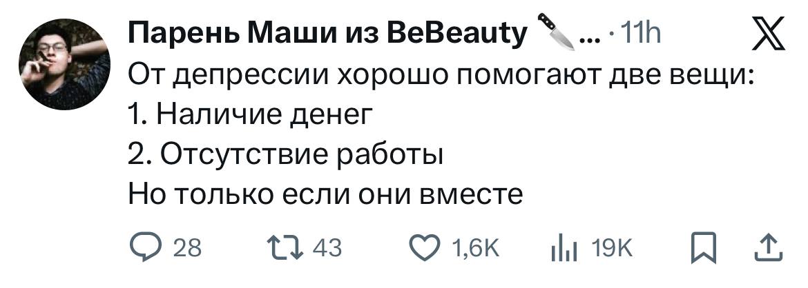 3 января 2026, 21:05 Настя ИзмайловаЮмор за день и жадный Олег ✕ Размер шрифта: 17px ✕ Ссылка скопирована! А вы замечали, что проблемы в личнойжизни придают алкоголю какой-тоособенный привкус? юмор