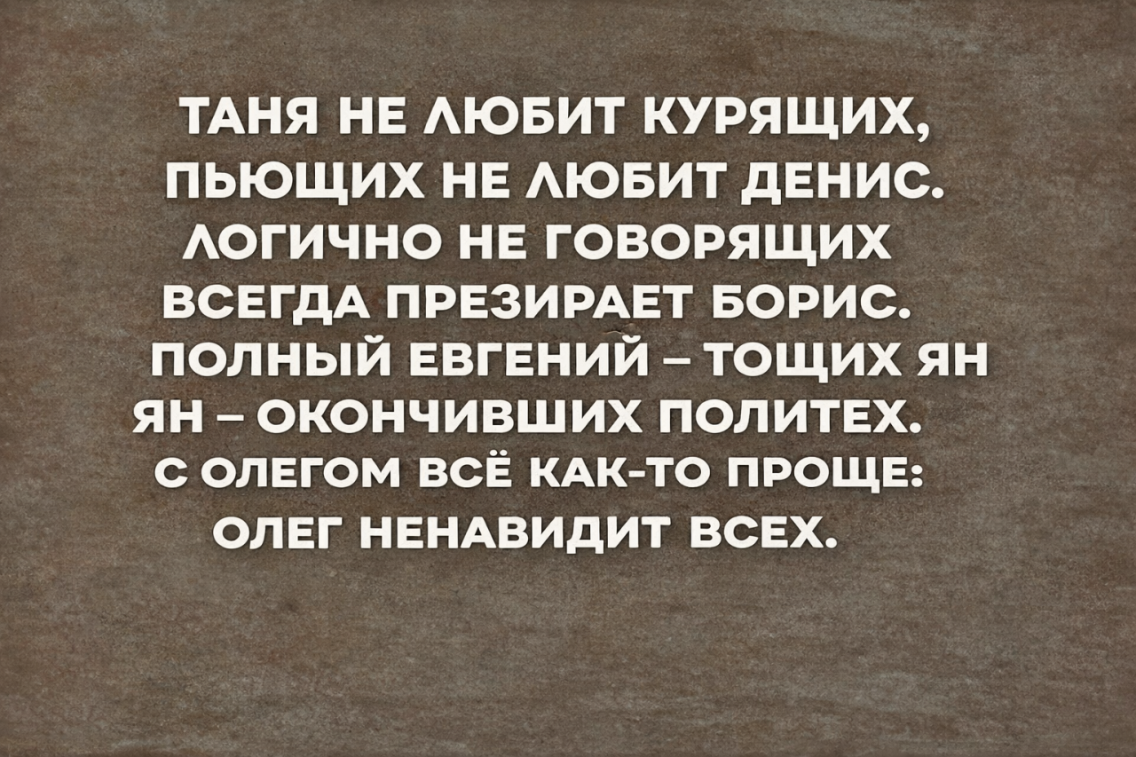 7 января 2026, 19:05 Настя ИзмайловаЮмор за день и опытный игрок в тетрис ✕ Размер шрифта: 17px ✕ Ссылка скопирована! Проблема с браком в том, что он был придуман в те времена, когда люди жили до 30 юмор