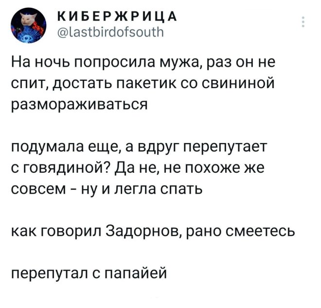8 марта 2026, 15:07 Алексей ИвановЗабавные комментарии, которые как острый соус приправляют сам пост ✕ Размер шрифта: 17px ✕ Ссылка скопирована! Очередная подборка забавных высказываний и комментариев из социальных сетей и других частей интернета.