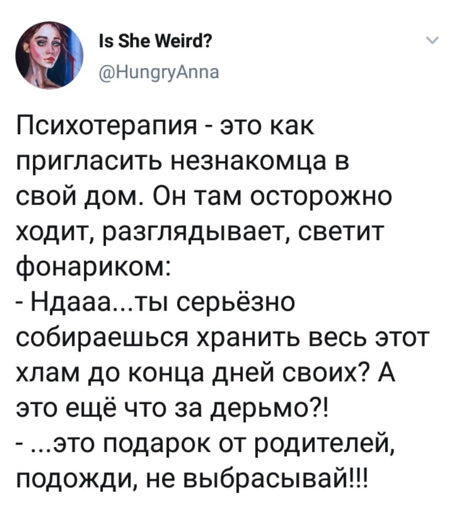 Эти мемы - как секретный язык. Две строчки текста и дурацкая картинка, а внутри всё переворачивается. Потому что кто-то другой тоже проходил через это. И тоже смеялся потом над тем, над чем раньше плакал. И самое смешное - теперь, когда друзья шлют тебе «обычные» мемы про котиков и кофе, ты ловишь себя на мысли: «Мило… но где тут про границы и объектные отношения?» Добро пожаловать в клуб. Здесь свои шутки. И они лечат лучше, чем кажется.