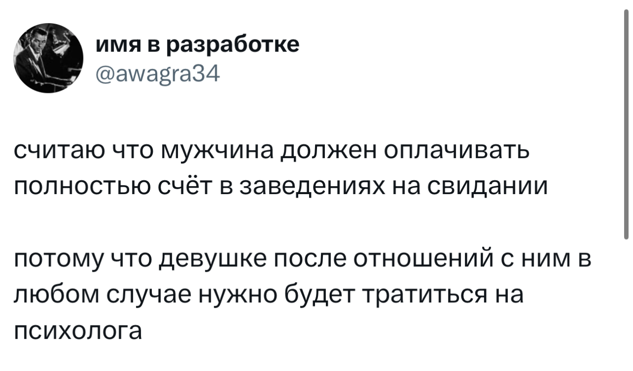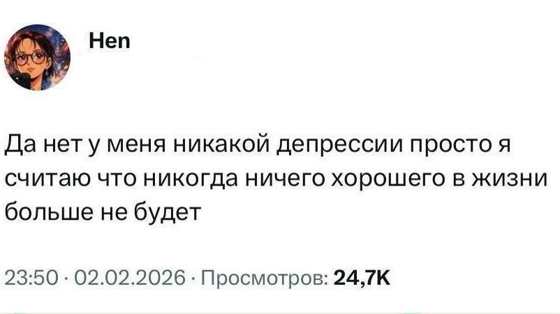3 апреля 2026, 21:05 Настя ИзмайловаМемы за день и ровесники ✕ Размер шрифта: 17px ✕ Ссылка скопирована! Мир требует от нас слишком многого, а я просто хочу…бежать по лужам в резиновых сапогах, не думая о том, как я выгляжу. юмор