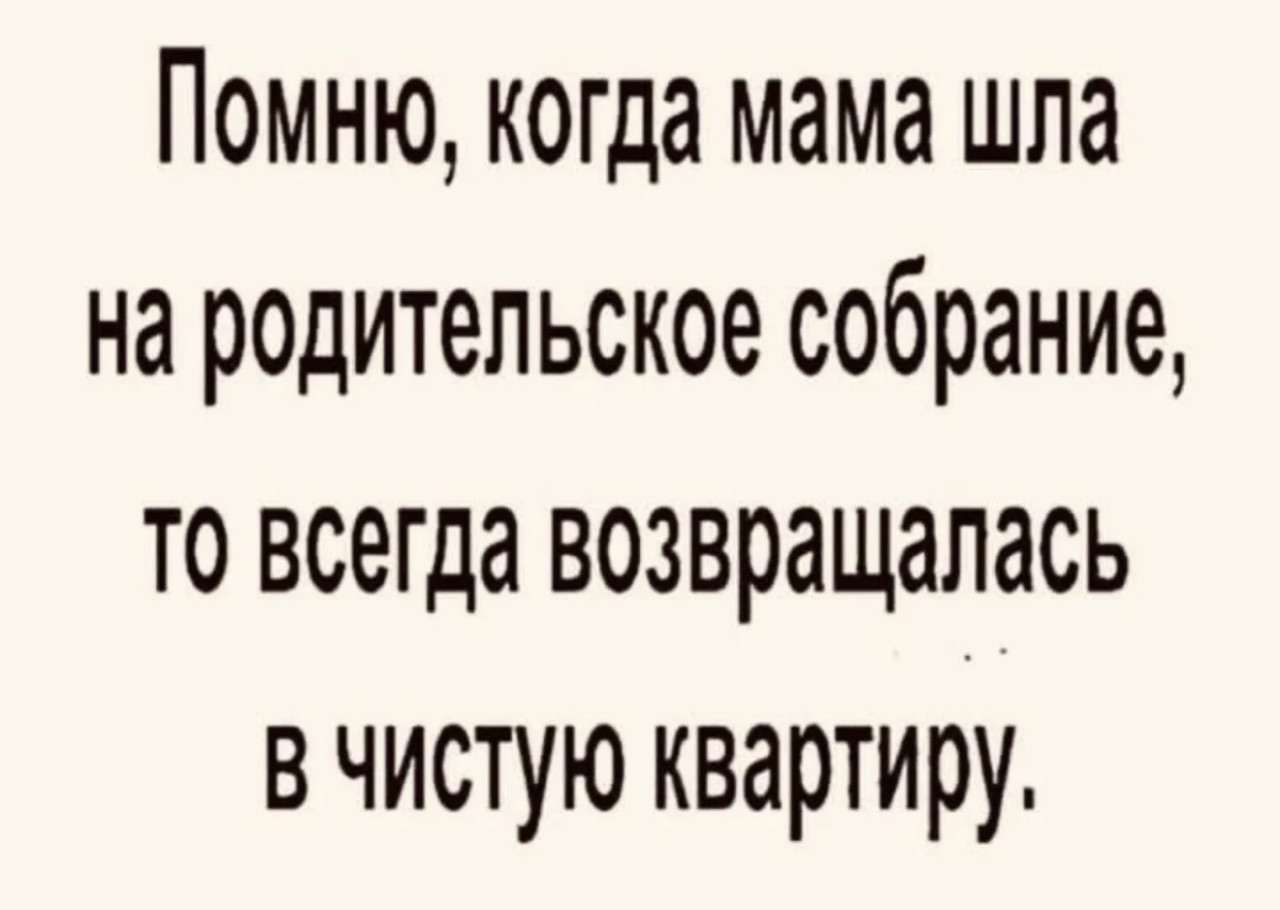 8 апреля 2026, 19:05 Настя ИзмайловаЮмор на вечер и надежды ✕ Размер шрифта: 17px ✕ Ссылка скопирована! Помню, когда мама шла на родительское собрание,то всегда возвращалась в чистую квартиру. юмор