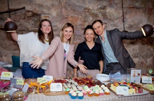 _Добровольные помощники «Зеленой лампы» Кристина Паничева, Дарья Рыковская и звезды Рижского русского театра Екатерина Фролова и Алексей Коргин за прилавком благотворительной ярмарки._