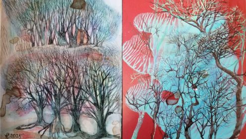 А еще Яна Микоса - очень интересный художник-график. Свет, дерево, человек - эти темы переплетаются в ее творчестве. Она закончила Художественную академию, отделение графики, училась керамике. Яна рисует миниатюры деревьев, и это не пейзажи, это портреты деревьев, личности со своим характером. Она считает, что деревья соединяют две важные стихии - землю и воздух.