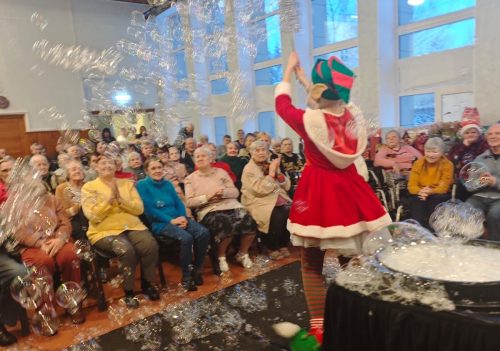 В этот день к ним всем пришел настоящий праздник. С музыкой, песнями, кукольным театром, шоу мыльных пузырей. Огромные Мишка и Гусь, ростовые куклы, устраивали игры и танцевали перед зрителями, которые не могли сдержать слез радости. Ну и, конечно, бабушки и дедушки подпевали и хлопали в ладоши.